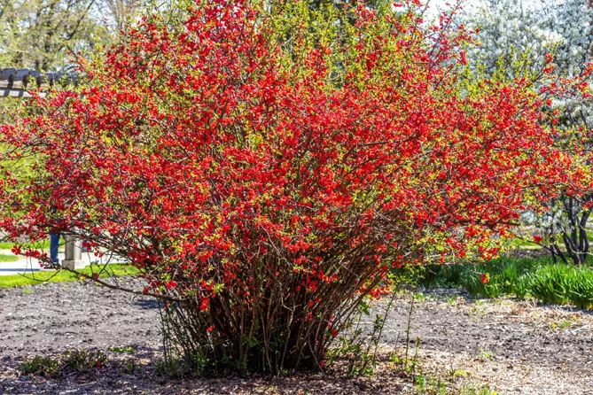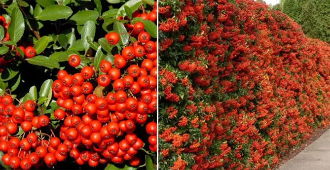 Листопадний чагарник піраканта яскраво-червона (Pyracantha coccinea), що виростає до 2-3 м у висоту. Має овальні напіввічнозелені листки, які буріють і опадають тільки після сильних заморозків. У м’які зими листя може залишатися на кущі практично до кінця зими. Цвіте піраканта у травні-червні. Квітки маленькі, білі. Яскраво-червоні або жовті плоди залишаються на кущі взимку.