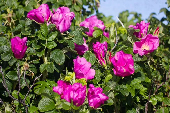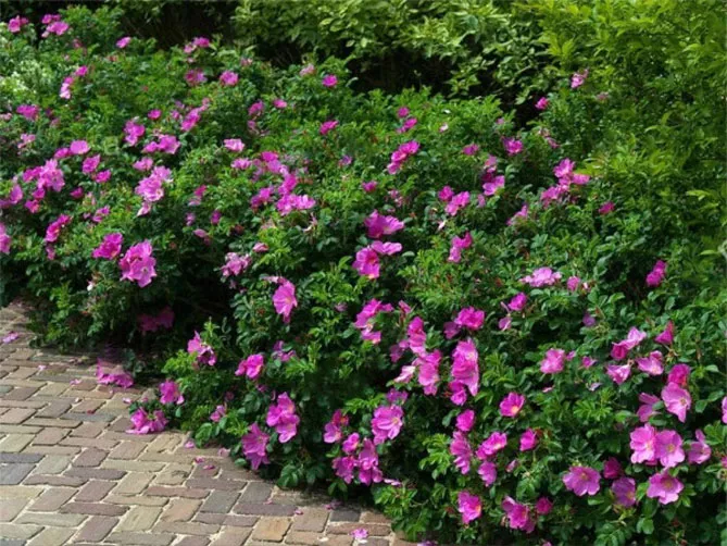 Для посадки перед парканом можна використовувати Шипшину зморшкувату і дикі види, що мають гарні квіти і червоні плоди. Шипшина зморшкувата виростає до 2 м. Росте на сухих ґрунтах. Кущ має низькі вимоги і виняткову життєздатність, здорове листя і інтенсивний аромат. Він відмінно підходить для масових посадок, створення ароматного живоплоту. Важко пройти повз байдуже – квіти шипшини дивують ароматом і красою.