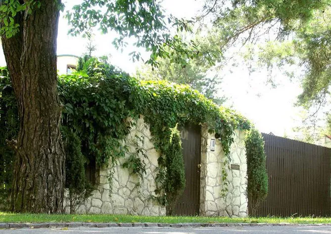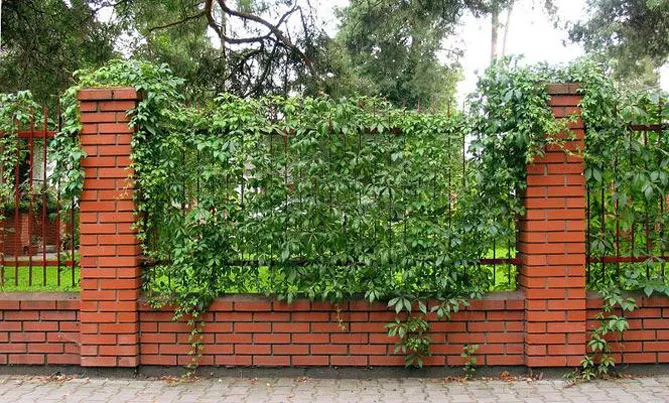 - Цегляний або кам’яний паркан можна гарно прикрасити квітучою ліаною (клематис) або плющем.