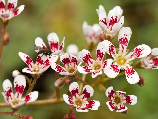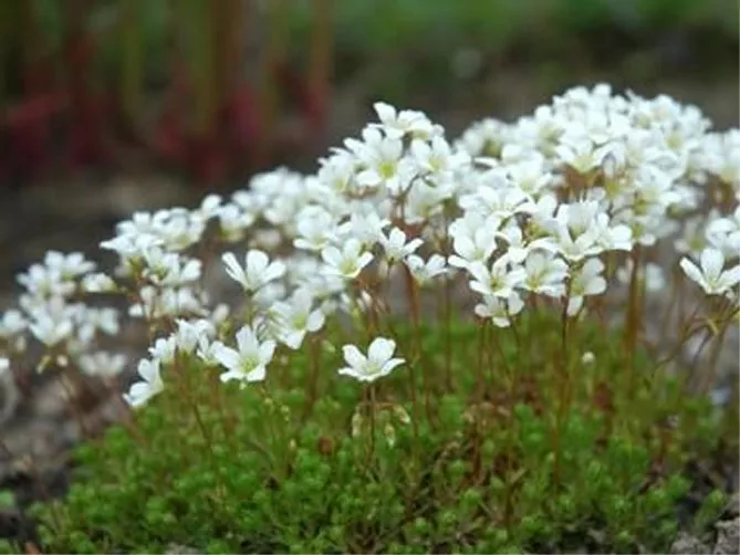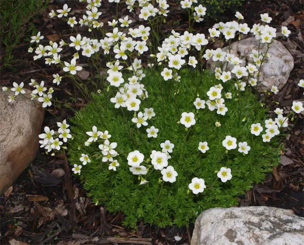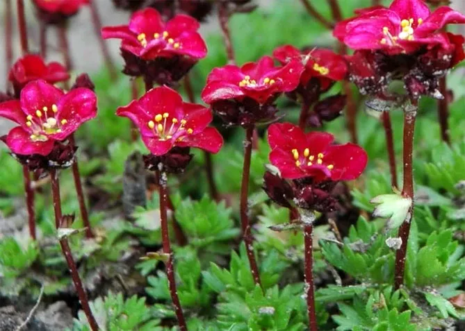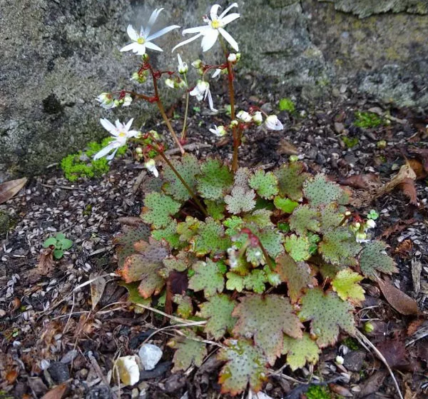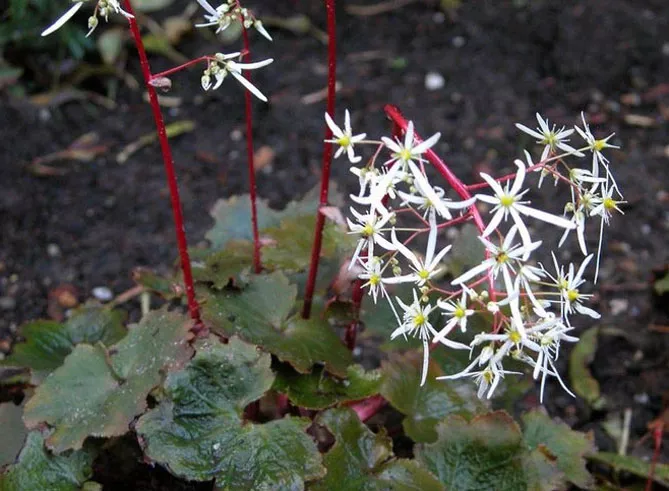 Листки з рифленим краєм, квітки зібрані в рихлі волоті, зіркоподібні, білі з червоним центром. Висота квітучого куща може досягати 30 см. Цвітіння настає у травні. Розмножується краще поділом. Ідеально підходить для тінистих рокаріїв, як ґрунтопокривна.
