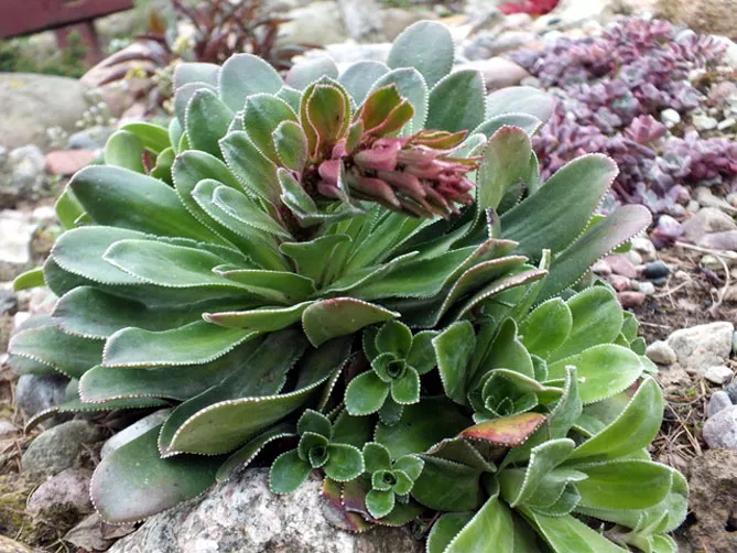 Розрив-трава котиледон – менш вимогливий вид, у природному середовищі існування зустрічається в Альпах. Висота без квітучих пагонів становить 10-15 см, під час цвітіння висота досягає 50 см. М’ясисті і зубчасті листки утворюють великі розетки, з яких росте квітконос. Після цвітіння розетка відмирає, але перш ніж це станеться, вона створить багато нових розеток. Білі квітки з’являються у червні, утворюючи волотисті суцвіття.