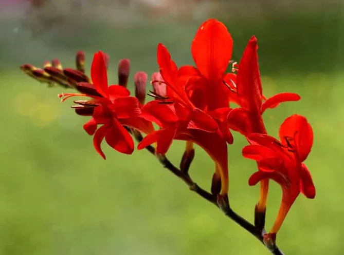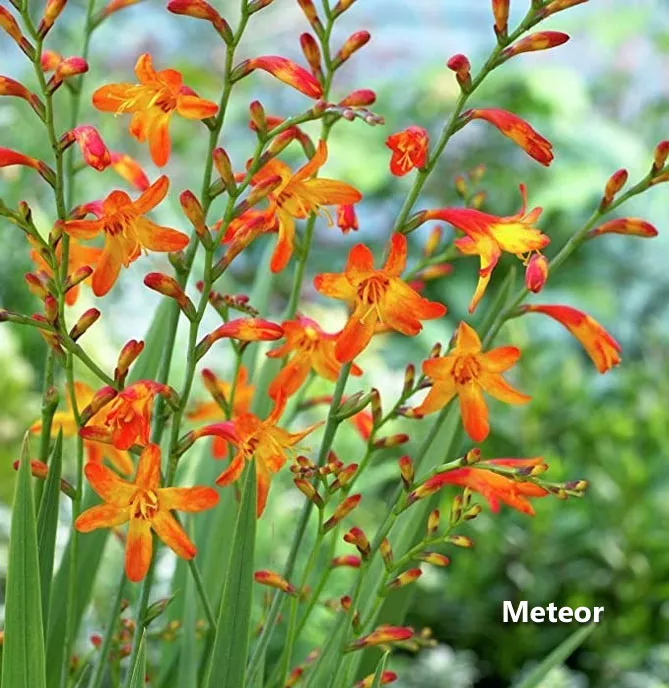 Крокосмія (лат. Crocosmia) також відома як японський гладіолус монтбреція належить до родини Півникових (Iridaceae). За зовнішнім виглядом рослина багатьом нагадує гладіолуси. У природному середовищі багаторічна монтбреція зустрічається на території Африки, у садах і парках – вирощується в Європі. У країнах походження крокосмію запилюють пташки колібрі, у нашому кліматі – бджоли, джмелі виконують аналогічну роль. Рослина, що росте в дикій природі, звикла до теплого клімату, тому не морозостійка.