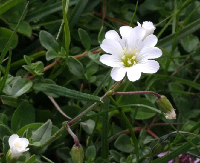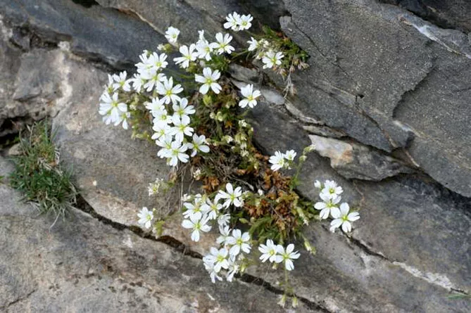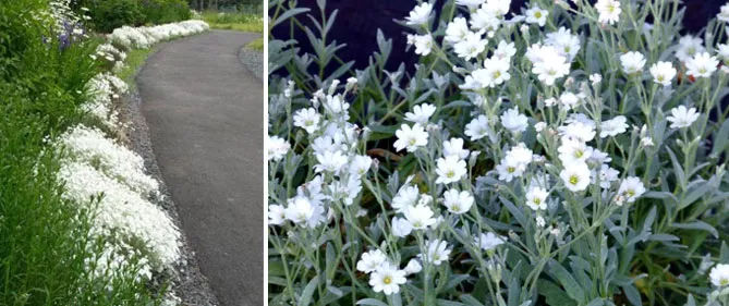 Ясколка альпійська (Cerastium alpinum) – створює килими білих квітів. Багаторічна рослина з тонкими, розгалуженими, повзучими стеблами та яйцеподібним, опушеним сріблястим листям, що досягає довжини 2 см. Білі квітки формуються на квітконосах на висоті 5-7 см над рослиною. Квіти з'являються з травня по червень.