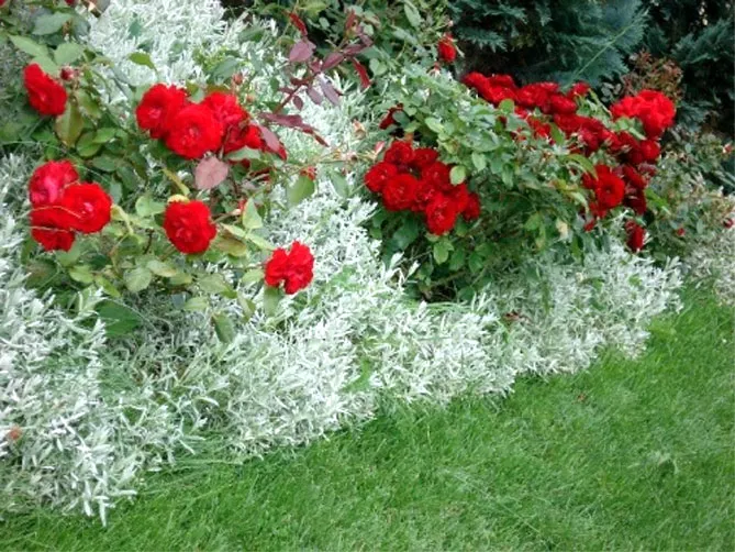 Фото. Ясколка, навіть не квітуча, гарно виглядає поряд із трояндами, створюючи сіруватий фон для яскравих квітів троянди.