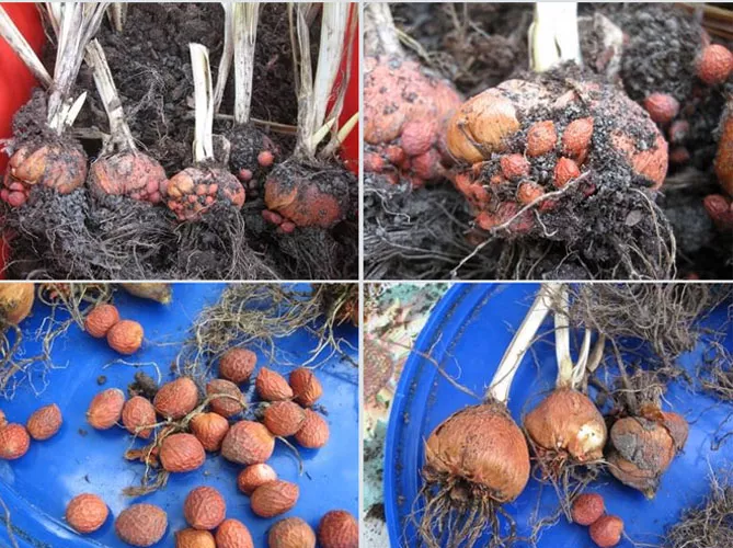 - Приблизно через 2 тижні видаляють залишки листя та квітконосів, стару висохлу материнську бульбу, відокремлюють дочірні бульби, яких буває кілька. Поруч із ними прикріплені маленькі бульби-дітки.
