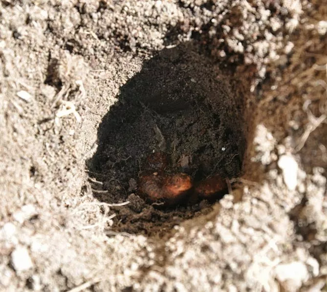 - Схема посадки: бульби висаджують у лунки на глибину близько 5 см, дотримуючись відстані між ними 15-25 см.