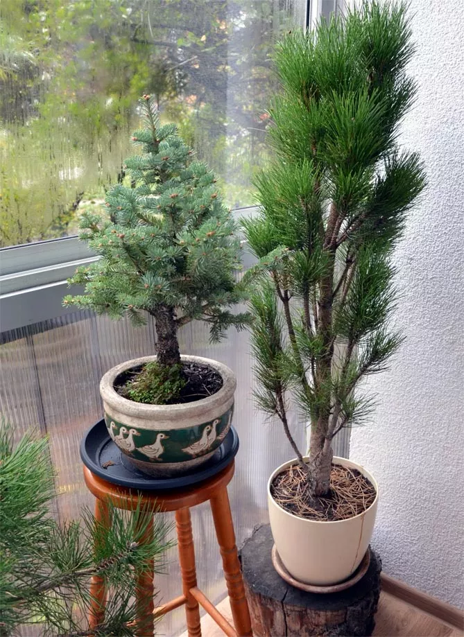 Це споріднені види дерев. Фіолетові шишки рослини виглядають дуже оригінально. Сосни чудово виглядають у прямокутних горщиках. Можна комбінувати їх з іншими хвойними деревами.