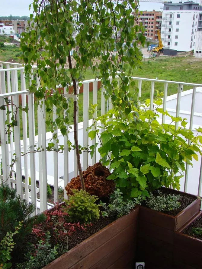 Маленький, обмежений за розміром балкон може стати маленьким лісом. Скромна сосна або береза, скупчення диких трав допоможуть відірвати погляд від екрана комп'ютера, дозволивши забути про метушню і набагато більше сприяють відпочинку, ніж свято квіткових барв. Правда, таку галявину важко порівняти з дикою природою, але навіть для птахів вона приваблива. Горобці та синички на гілках дерев шукають їжу.