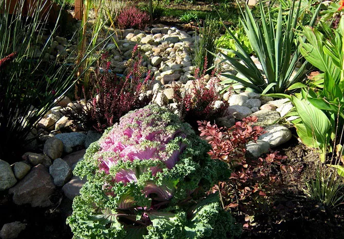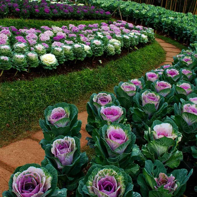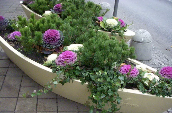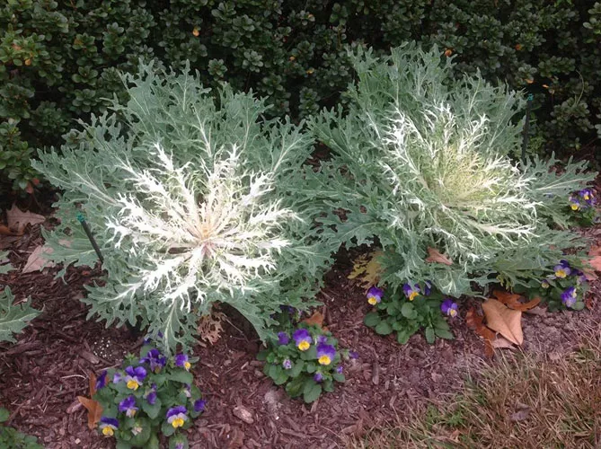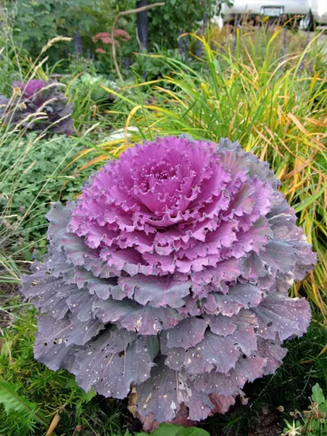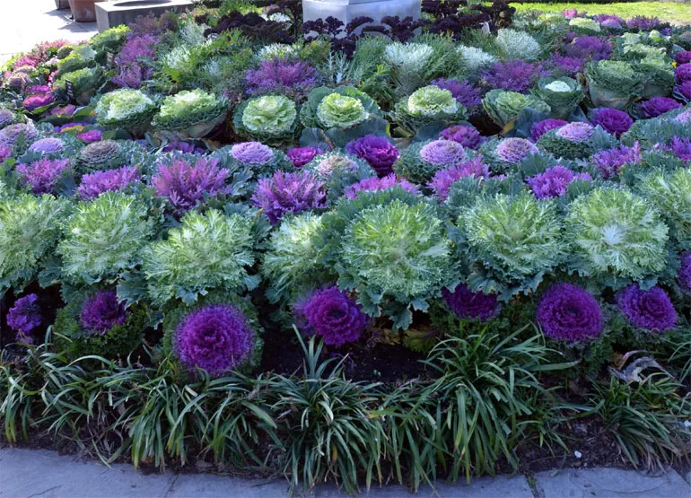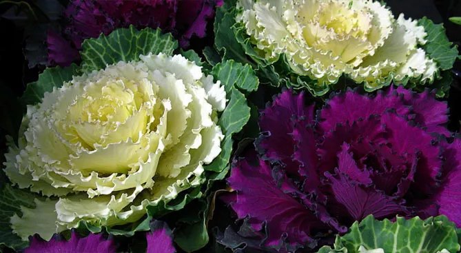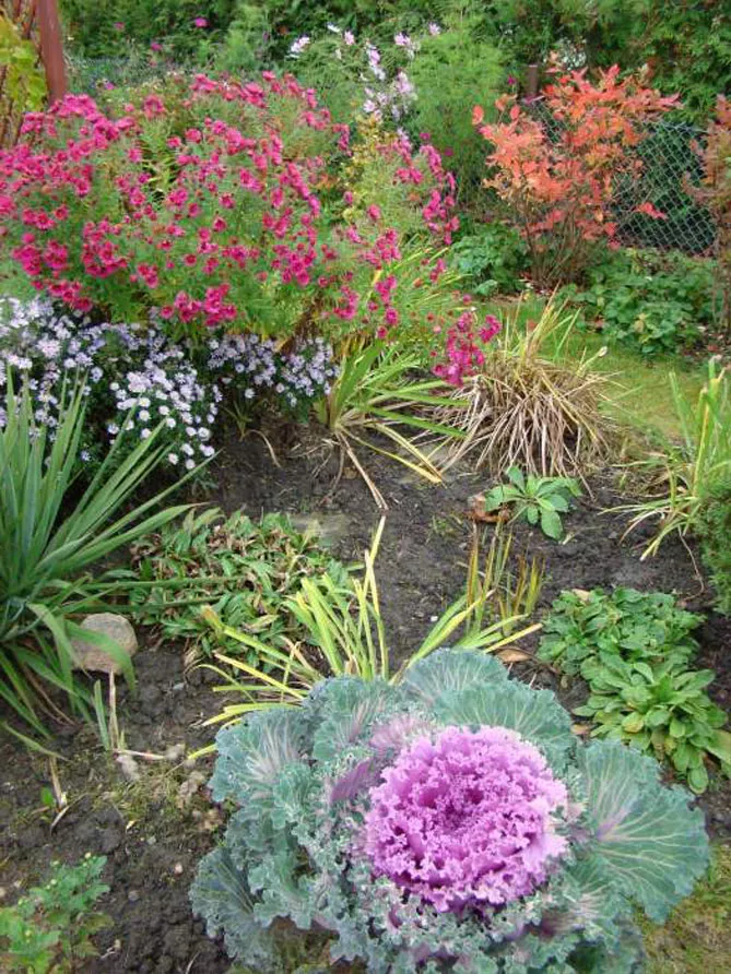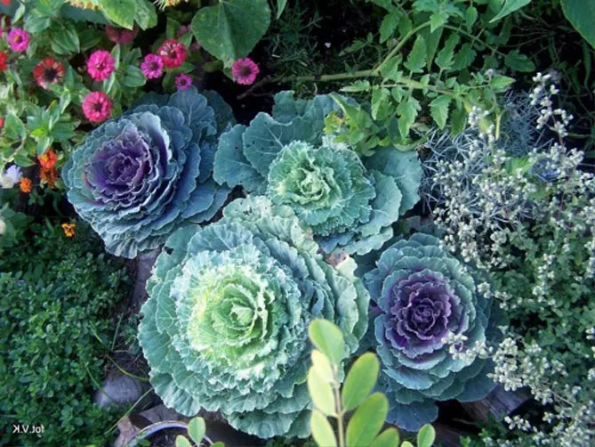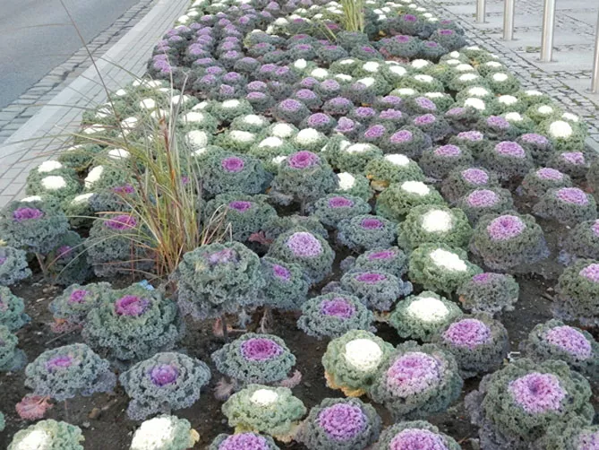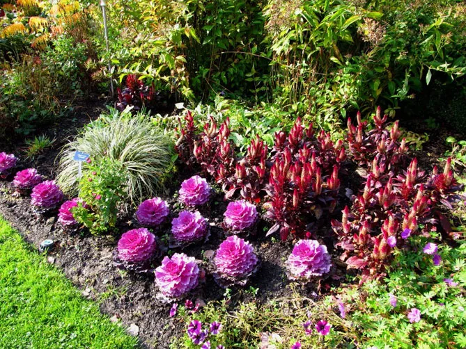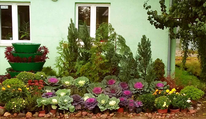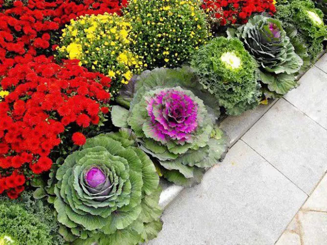 Декоративні кущі капусти є цінним доповненням до осінніх клумб, гарно виглядають з: