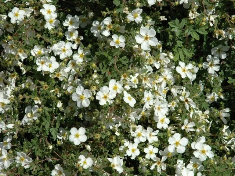 Листяний чагарник п'ятилистник цвіте довго – з середини травня по жовтень. Сорти розрізняються переважно забарвленням квітів: