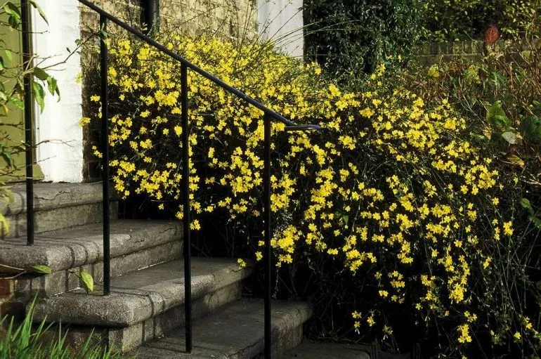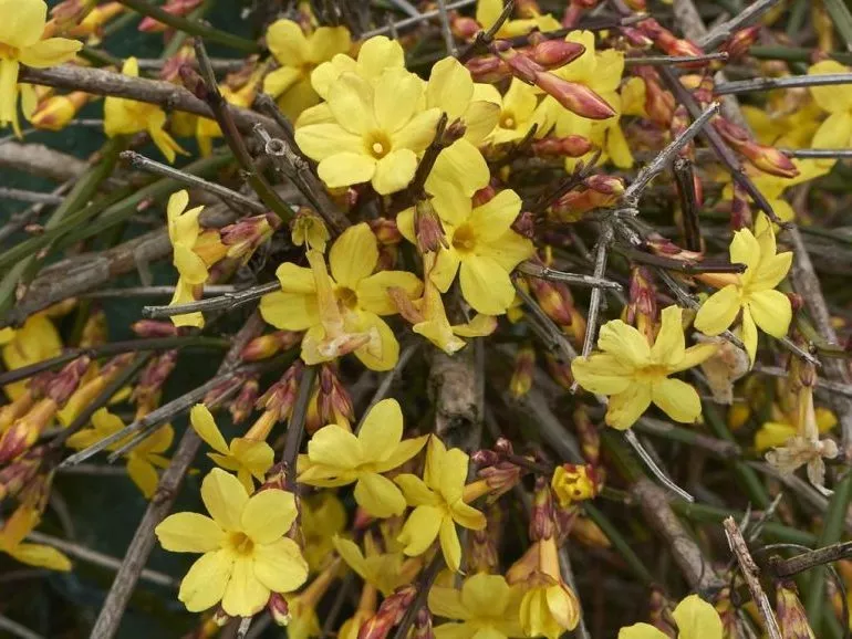 Чагарник висотою до 3 м. Перші квіти з'являються в кінці вересня, цвіте до перших заморозків. Жасмин знову починає цвісти у січні, цвіте до кінця квітня, з перервами під час морозів. При сильному морозі квіти можуть обсипатися. Інтенсивно-жовті квіти ростуть поодинці на тонких, безлистих пагонах. Чагарник часто в'ється, необхідна підв'язка стебел на опору. Краще підходять сонячні або трохи затінені експозиції, необхідний захист від вітру. У теплих регіонах цвіте рясно, немає небезпеки замерзання квіткових бруньок.