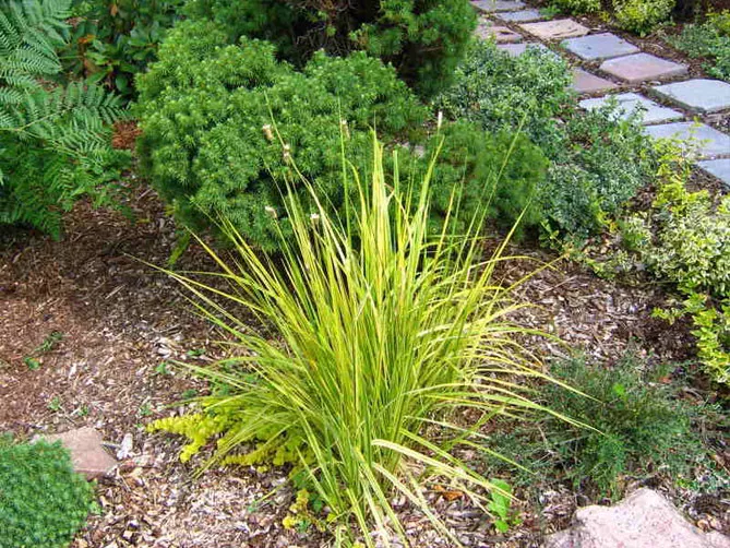 Декоративна багаторічна трава спартина гребінчаста «Ауреомаргіната» (Spartina Pectinata Aureomarginata) має свисаючі темно-зелені листки з жовтими краями. Виростає до 150 см. Засохлі суцвіття та листки прикрашають рослини і взимку.