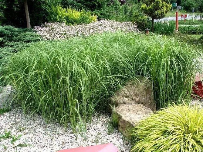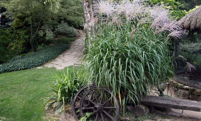 Декоративна висока трава міскантус цукроцвітний (Miscanthus sacchariflorus) досить легко розростається і утворює великі куртини висотою близько 150 см. У серпні відростають великі сріблясті метелки пухнастих суцвіть, які залишаються на рослині до зими.
