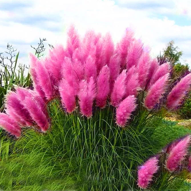 Унікальний декоративний злак пампасна трава (Cortaderia selloana) нагадує фонтан з високих листків, який влітку та восени вражає ефектними пір’їстими суцвіттями, що з’являються над листками на жорстких пагонах, що складаються з величезної кількості дрібних шовковисто-рожевих колосків. Частіше метелки білого забарвлення, є сорти з жовтими або рожевими квітами. Красиві метелки квітів переживуть глибоку холодну зиму.