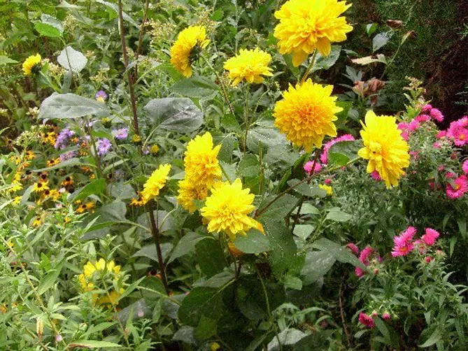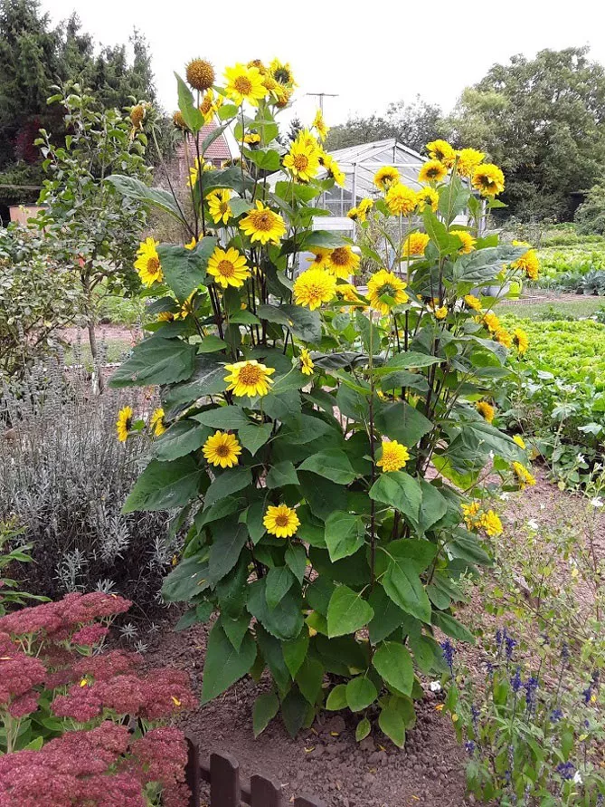 У відкритому сонячному саду можна посадити високі стрункі соняшники ближче до інших гігантських рослин, що цвітуть восени: