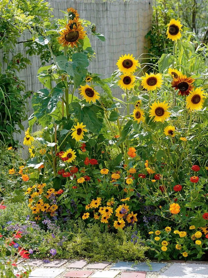 Барвисті квіти-соняшники завжди вносять багато жвавості, легкості та бадьорості в сад наприкінці сезону. Ці дуже мальовничі рослини часто висаджують біля підніжжя грядок поодинці або групами, створюючи чарівні сільські пейзажі в кожному куточку природного саду, наприклад, на квітучому лузі.