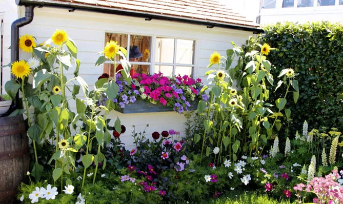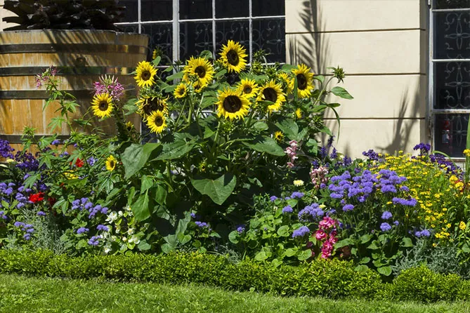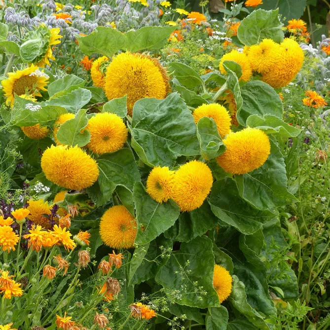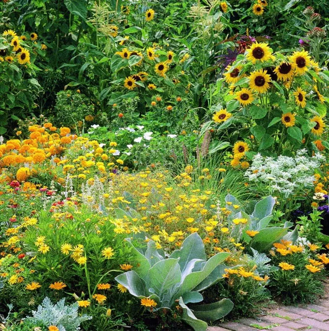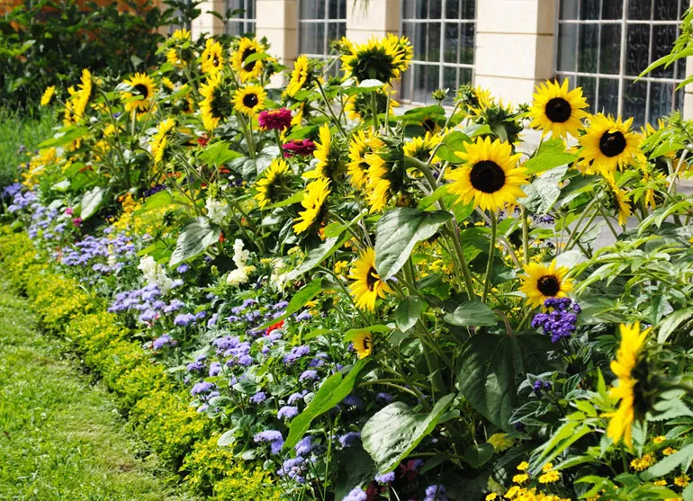 На великій клумбі великі пучки жовтих соняшників будуть сяяти до перших заморозків, оточені іншими квітами, які сховають основу його високих стебел: