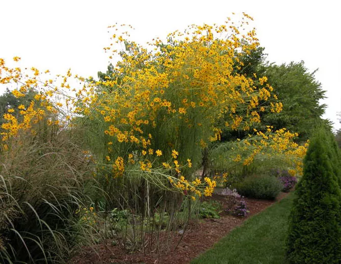Високий, дуже мальовничий багаторічник Соняшник верболозний (Helianthus salicifolius) цвіте з вересня по жовтень. Висота – 2 м. Це рослина з тонким листям, схожим на вербу, та великими жовтими квітами, схожими на маргаритки. Саджайте його внизу клумби окремо або у компанії з високими травами.