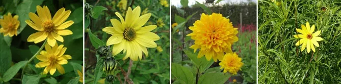 Фото. Деякі багаторічні геліантуси: H. microcephalus, H. ‘Lemon Queen’, H. decapetalus ‘Plenus’, H. salicifolius (зверніть увагу на особливе листя)