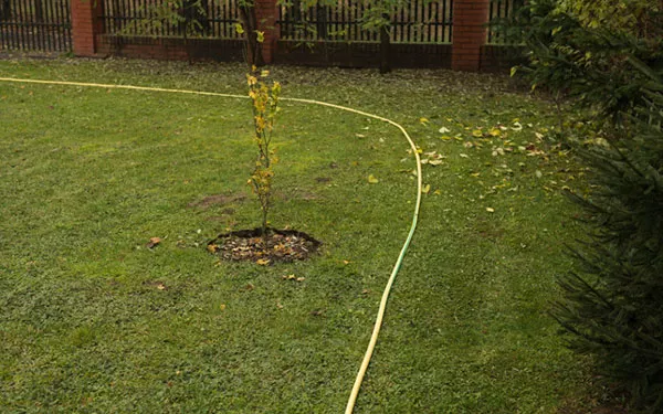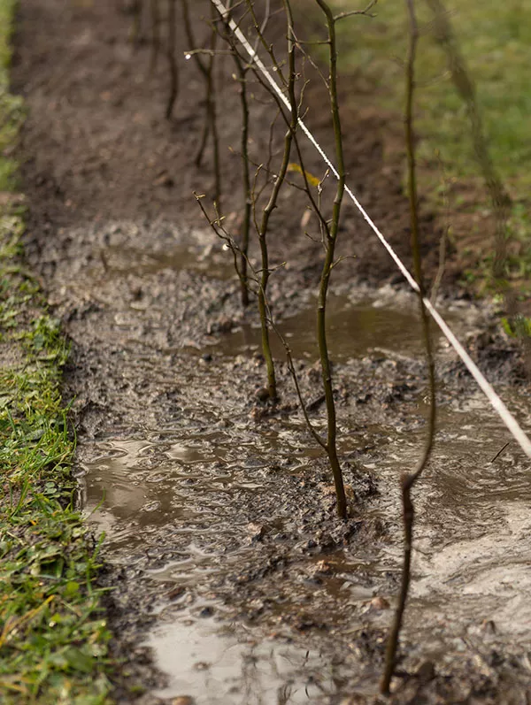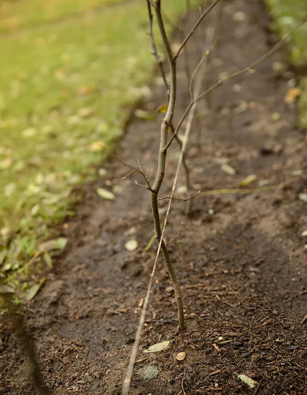 Найкращий метод – це посадка з почерговим поливом. Помістіть рослину у ямку, присипте невеликою кількістю ґрунту і полійте. Вода змусить ґрунт покрити кожен корінь, виштовхуючи повітря з-під кореневого кома. Коли води більше не видно (все ще тримаючи саджанець), присипаємо ґрунтом і знову поливаємо. Повторюємо дію, поки рослина не буде покрита ґрунтом до відповідного рівня, тобто рівня, на якому вона росла у розпліднику. Рівень кореневої шийки видно за рахунок іншого кольору кори.