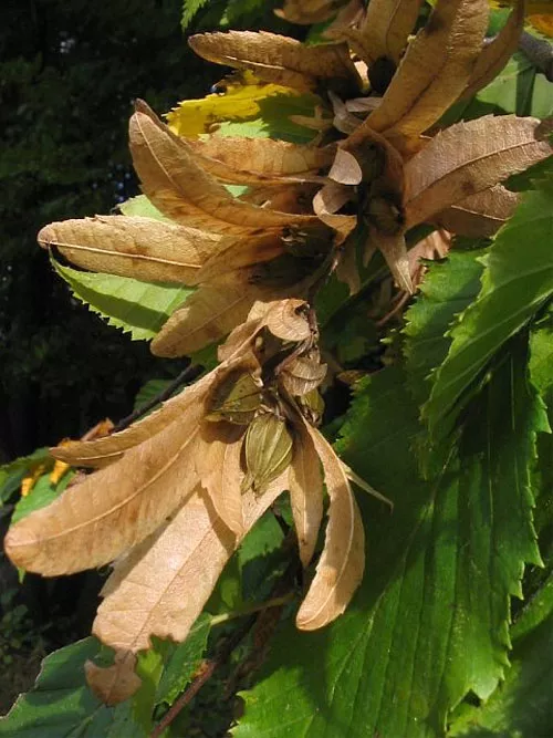 - Темно-коричневі овальні плями на листках означають появу гриба Gloeosporium carpini, який зимує на опалому листі і викликає глеоспоріоз. Для профілактики грибкових інфекцій потрібно видаляти опале листя, а уражені рослини оприскувати фунгіцидами.