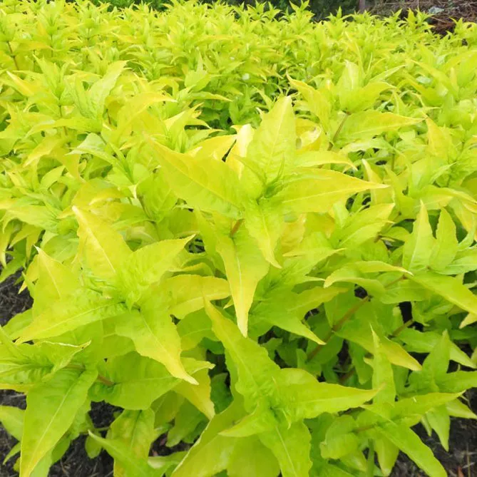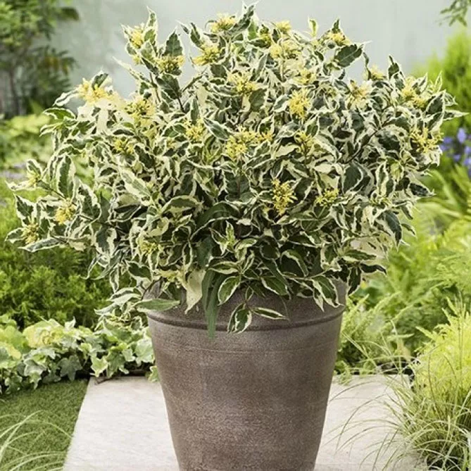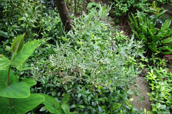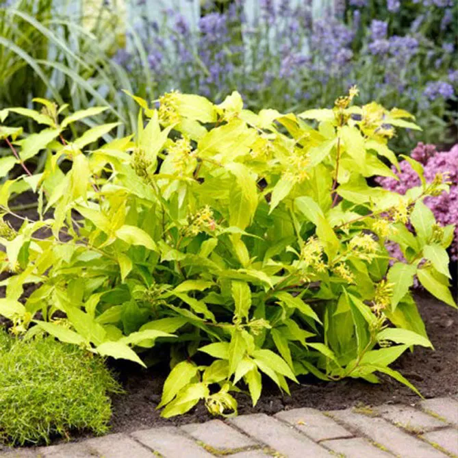 Дієрвілла блискуча (Diervilla splendens) цвіте у липні-серпні. Висота дорослого куща – 1,2 м. Цей гібрид садового походження з розлогим габітусом, що досягає 2 м у розмаху, є ідеальною ґрунтопокривною рослиною для сухих, затінених або помірно сонячних ділянок. Його гарне темно-зелене літнє листя стає оранжево-фіолетовим восени. Влітку на молодих пагонах з'являються китиці блідо-жовтих квітів. Кущ рясно цвіте навіть у тіні, де він особливо любить рости.
