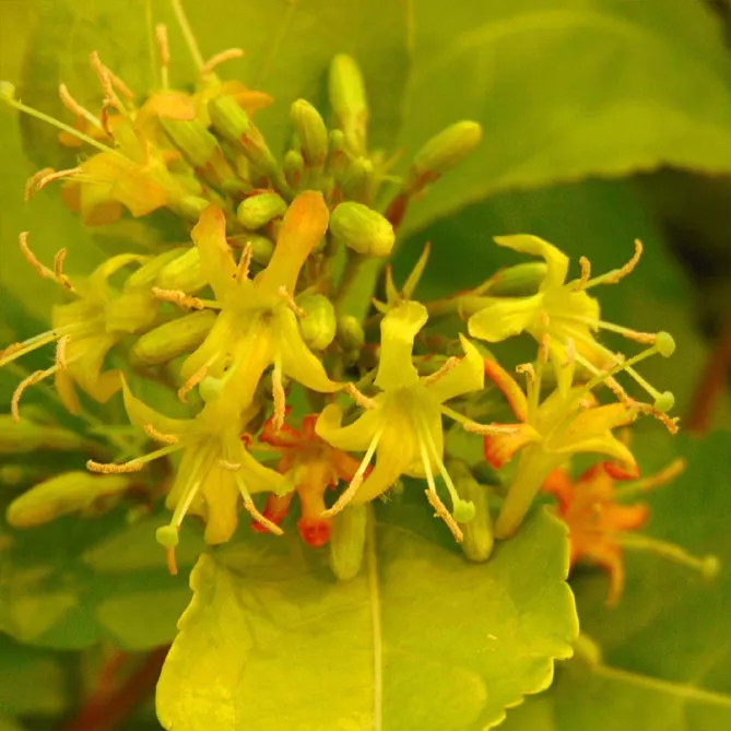 Суцвіття з дрібних верхівкових квітів мають свіжі зеленувато-жовті, а потім лимонно-жовті відтінки, які освітлюють підлісок у травні-червні (вид Дієрвілла жимолостна) та у липні-серпні (інші види). Квіти формуються на пагонах минулого року. По мірі цвітіння забарвлення квітів змінюється у бік кремово-білого, потім з'являються маленькі темно-червоні ягоди.