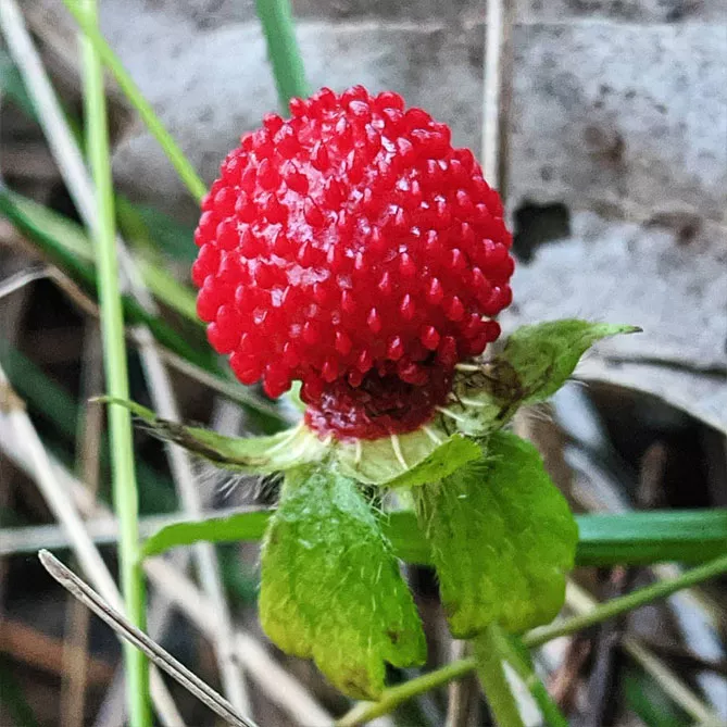 Фото. Плоди дюшенеї (перстача) індійського прямостоячі і звернені до неба, ягоди суниці опущені вниз