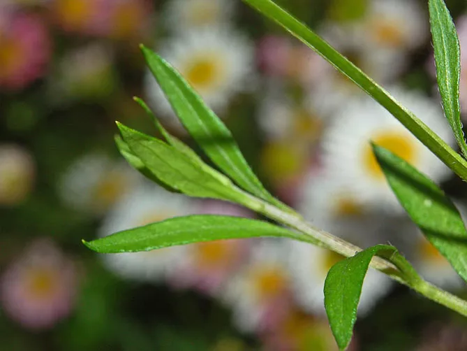Еригерон або дрібнолепестник гострий (їдкий) (лат. Erigeron acer) родом з Америки. Листки ланцетної форми, вузькі, подовжені, розташовані на стеблі нерівномірно. Стебла сильно розгалужені, прямі, червонуваті. Стебло, як і листки, вкриті грубими волосками.