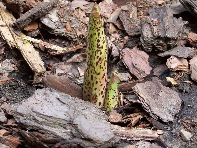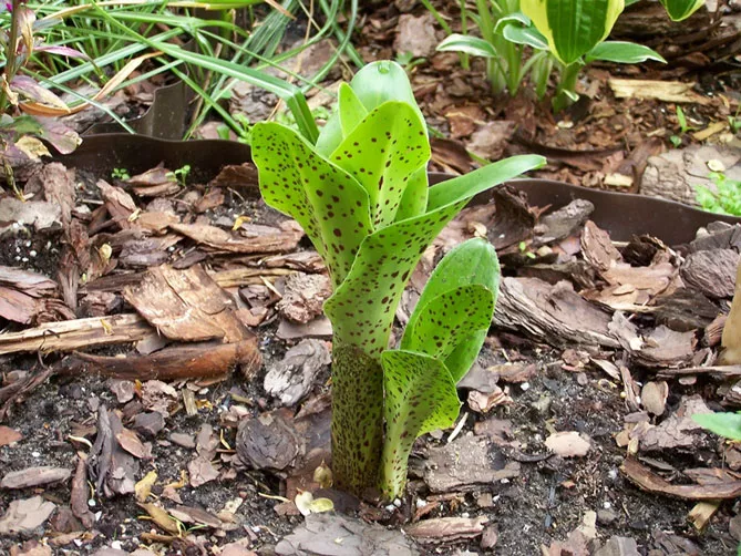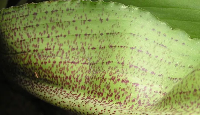 - Листя – велике, ланцетне, світло-зелене, з чітко вираженою головною жилкою та пурпурними цятками на нижній стороні, зібрані в розетку, що досягає висоти 20-25 см.