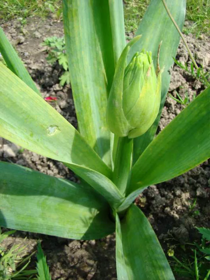Навесні з'являються листя: прикореневі, довгі, стрічкоподібні, прямостоячі, сіро-зелені, завдовжки 50-100 см. Вони утворюють прямостоячий пучок висотою 60-100 см і шириною 20-30 см. Восени листя жовтіє, взимку опадає, рослина йде у сплячку до наступної весни.