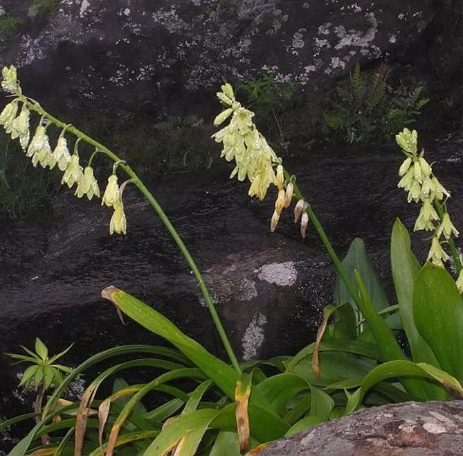 - Квіти: циліндричний стебло, що закінчується гарним 30-сантиметровим колосом, який складається з 20-40 чисто-білих звисаючих квітів, злегка ароматних, воскових.