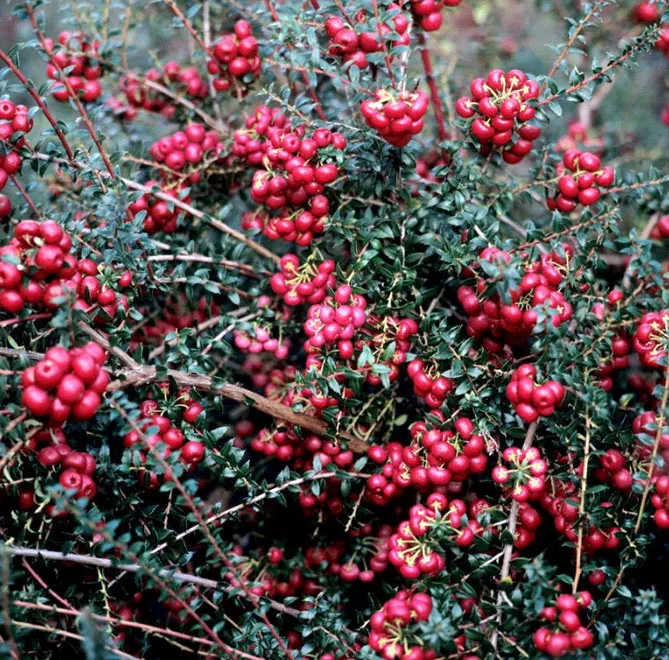 Вид Гаультерія загострена або гострокінцева (Gaultheria mucronate) синонім пернеттія гострокінцева (Pernettya mucronata) – це кущ, що досягає 1 м у всіх напрямках. Листя овальне або еліптичне, темно-зелене, блискуче, завдовжки 12-18 мм. Білі квітки завдовжки 6 мм, розпускаються у травні-червні. Плоди блискучі, м’які, розміром 10-15 мм, білого або пурпурного кольору. Вид родом із Чилі, Аргентини. Створює хороший ґрунтовий покрив у кислому ґрунті підліску.
