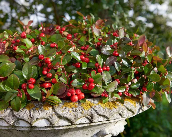 Гаультерію можна саджати у горщики для створення квіткових композицій. Можна комбінувати її з вересом та братками. Заповніть кашпо або кошик горщиковим ґрунтом, а потім посадіть рослини досить щільно.