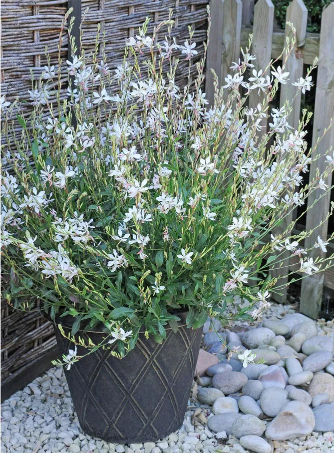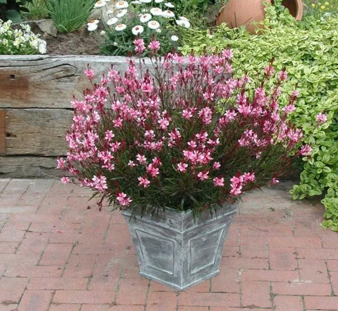 Можна посадити гауру в горщик або кашпо. Це дасть дуже гарний ефект, особливо в поєднанні з кількома багаторічниками або однорічниками. Для посадки в горщик потрібно обрати досить широку і глибоку ємність, на дно покласти гравій, щоб вода не застоювалася.