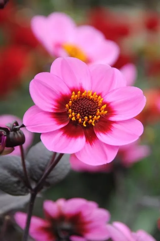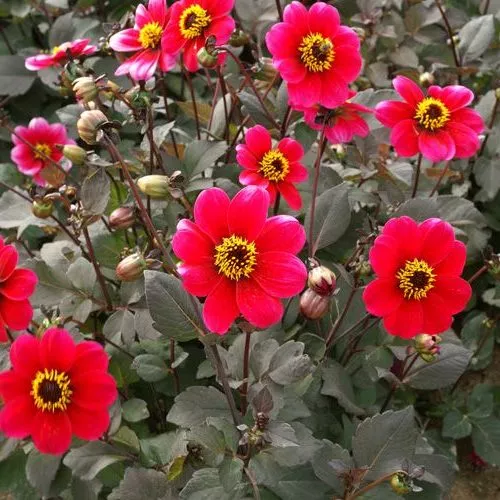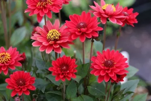 Високі одиночні георгіни з темними листками прикрасять високі грядки, зокрема: