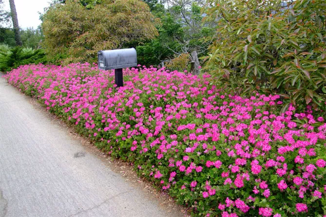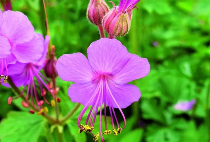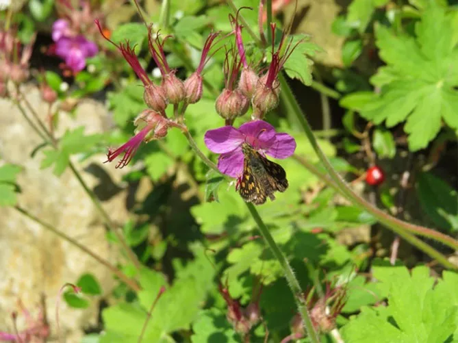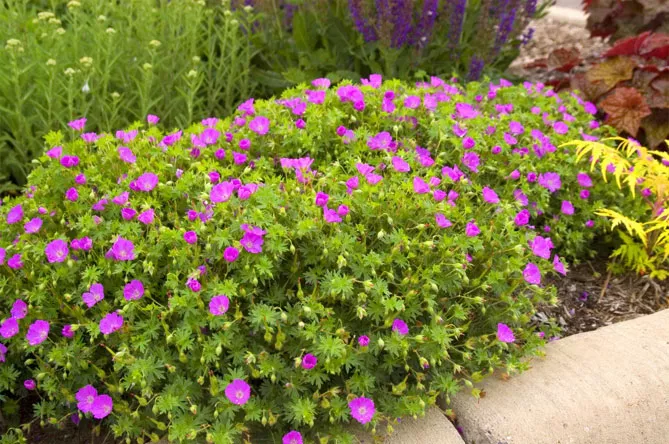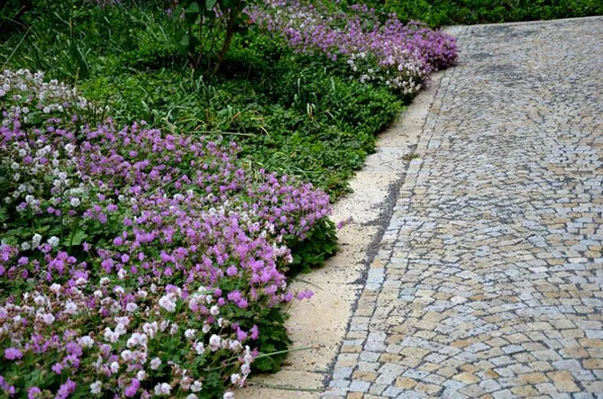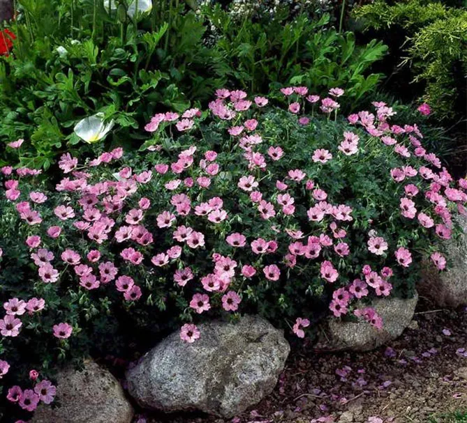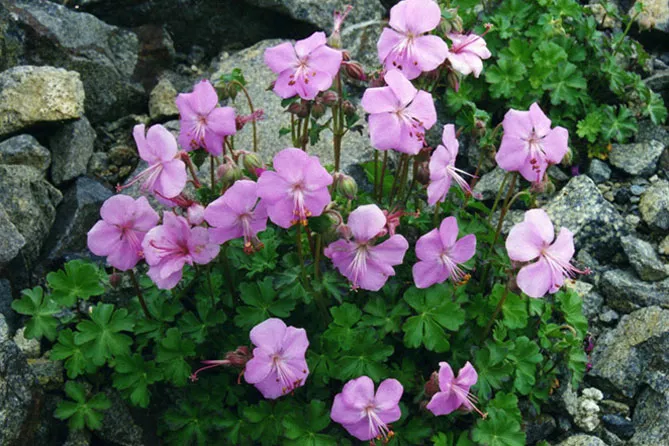 Герань далматська Geranium dalmaticum – досягає висоти 15 см, квіти блідо-рожеві, листя вічнозелене. Цвіте з червня по липень.