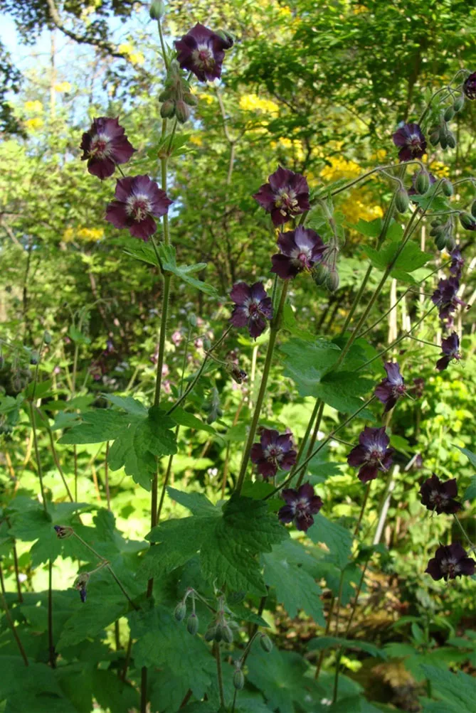 Незвичайним темно-фіолетовим забарвленням квітів відрізняється герань червоно-бура (Geranium phaeum). Її квіти можуть здаватися майже чорними. Виростає до 70 см у висоту, має відносно тонкий кущик. Ці герані краще ростуть у напівтіні та тіні. Зустрічається у дикій природі на півдні. Простота вирощування та невисокі вимоги роблять рослину широко використовуваною у садах, квітниках.