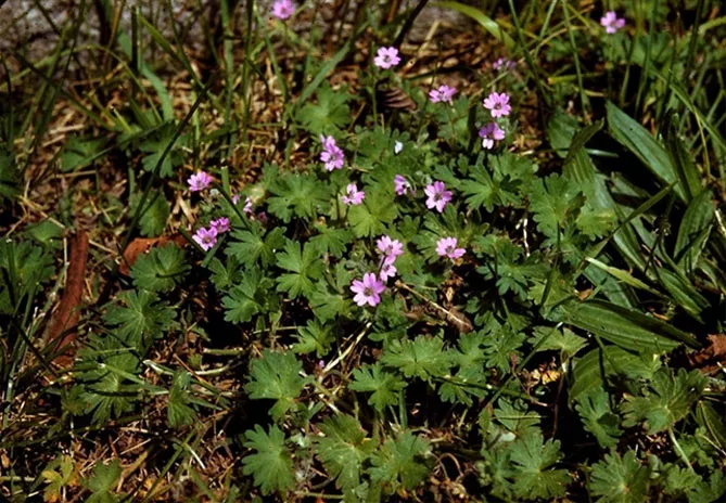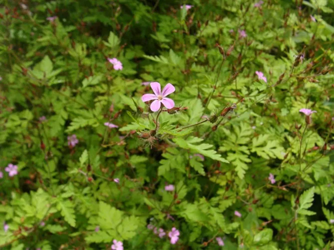 Невисока герань Роберта (Geranium robertianum) має дрібні рожеві квіти, посаджені на червонуваті квітконоси. Вид не вирощується у садах, хоча, якщо на дачі лісова ділянка, можна посадити його, тому що у природі він росте саме у лісах, заростях. Ця рослина має деякі цілющі властивості та використовувалася у фітотерапії. Має антисептичні, протизапальні властивості. Має неприємний запах, який відчувається, якщо розтерти частину рослини.