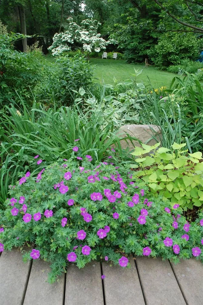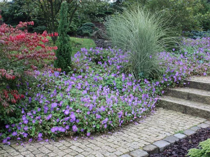 Гімалайську герань можна комбінувати з тюльпанами, гіацинтами, оскільки вона раніше випускає листя.