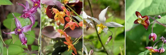 Фото. Епімедіуми пропонують чудове різноманіття квітів! Зліва направо горянки – великоквіткова (Epimedium grandiflorum var. Thunbergianum), варлійська (Epimedium warleyense), зірчаста (Epimedium stellulatum сорт ‘Wudang Star’), альпійська (Epimedium alpinum)