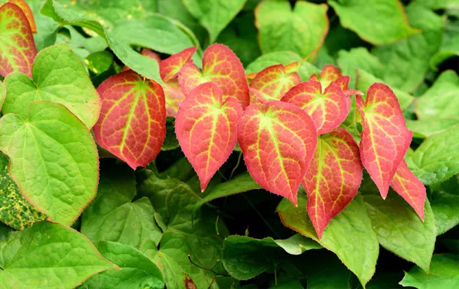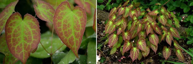 Зазвичай листя змінює колір залежно від пори року, особливо навесні та восени. Вони бувають червоними, коричневими, іноді фіолетовими. Візерунки на листі можуть мати крапчастий малюнок (показуючи жилки, які залишаються зеленими), округлі плями або облямівку по краю листової пластинки. У горянки червоної (Epimedium rubrum) ніжно-зелена пластина листка навесні забарвлюється у насичений червоний мармур (навколо прожилок, які залишаються зеленими), потім листя стає зеленим, а восени набуває коричнево-червоного відтінку.