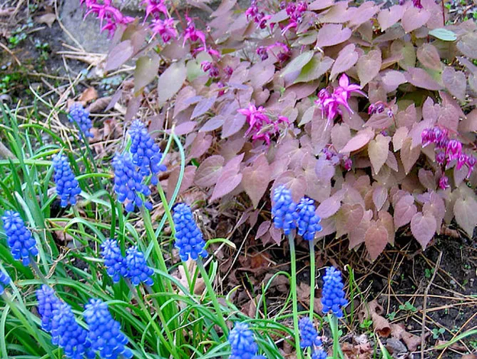 - Можна посадити епімедіум біля підніжжя дерев і кущів, у компанії з весняними квітами. Кущі дадуть невелику висоту, а епімедіуми гарно прикрасять підніжжя, перешкоджаючи росту бур'янів. Горянку можна посадити під такими кущами: