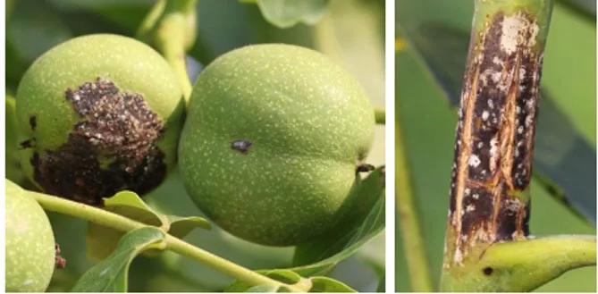 Фото. Бактеріальна гниль горіха (Xantomonas arboricola pv juglandis, синонім Xantomonas campestris pv juglandis) на листі, пагонах, плодах.