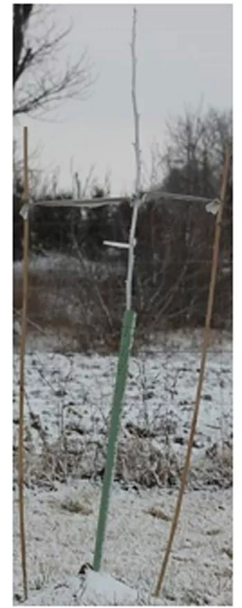 - Захист від морозів взимку – перфорована плівка проти тварин, мульча із соломою злакових (включаючи кукурудзу). Ствол можна пофарбувати силікон-акриловою фарбою для бетону, щоб захистити молоді дерева від перегріву взимку. Фарбують стовбур вище вкритої соломою частини разом із бруньками відразу після опадання листя.