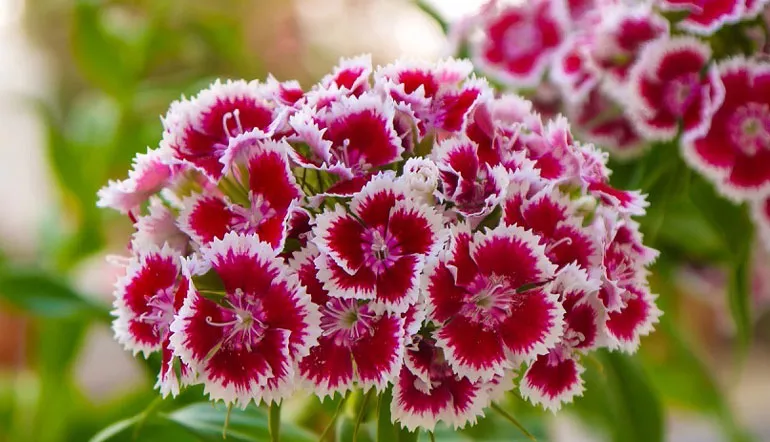 Цвітіння рясне, безліччю маленьких квіточок з бахромою, у різних кольорах – білий, червоний, рожевий, фіолетовий. Є сорти з строкатими квітами, у яких, наприклад, червона серцевина і кремово-білі кінчики пелюсток. На пелюстках часто є бордові смужки. Квіточки маленькі, не ароматні.