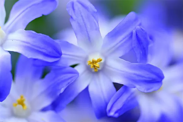 - Квіти хіонодокси – зібрані в невеликі групи від 1 до кількох штук. Оцвітина шестипелюсткова, зірчаста, з білим центром. Листочки оцвітини трохи нахилені назад. Квітнуть довго – кілька тижнів.