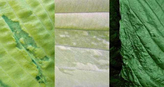 - Западання, поглиблення в тканині – зазвичай ознака важчої інфекції, схоже, що тканина листа зруйнована, і вся вода пішла з ураженої точки. Хоча іноді для опису явища використовується слово «зневоднення», тканина не є сухою чи мертвою і може залишатися такою до кінця сезону. Западання може супроводжуватися зміною кольору хости.