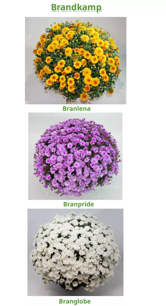 Селекція від «Брандкамп» пропонує сорти хризантеми мультифлора куляста компактної, майже кулястої форми – ранні сорти з білими, жовтими та золотисто-коричневими напівмахровими суцвіттями. До них належать: