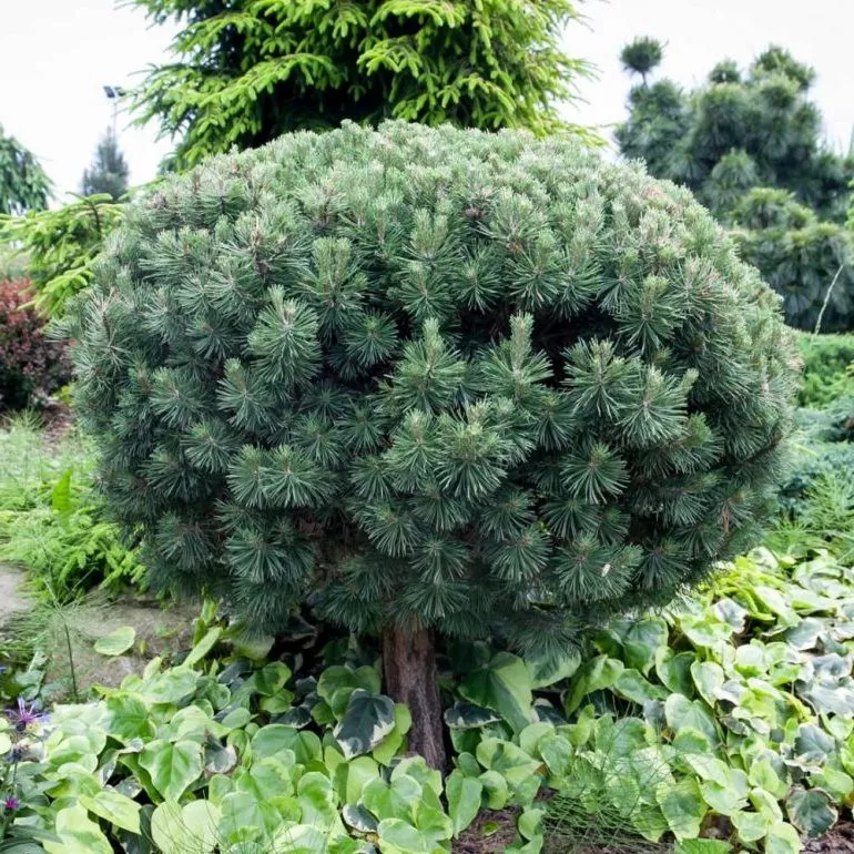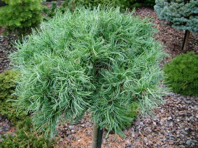 - Масляна сосна «Маленькі кучері» Tiny Curls – карликова різновидність зі сферичною формою. Характерна особливість – викривлені сріблясто-зелені голки, що надають пухнастість. Веймутка росте приблизно до 1 м у висоту. Надає перевагу субстрату зі слабкокислим pH.